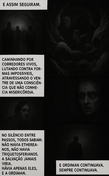 In this first season of the Space Ordiman comics, three stories taken from the book "Chronicles and Adventures" are presented. Of these stories, issues 1 and 2 tell about spirits who had already awakened from the simulation and are now in the real Ordiman, that colossal structure of metal and darkness. The third issue tells the story of a spirit still inside the simulation having contact with knowledge passed on by beings from the upper layers who are outside Ordiman, but guiding these spirits to help them leave the simulation through mental projection.